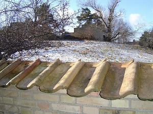 ローマハウスの住宅を特色付けるものに、建築物の外壁をおおう黄土色のレンガや屋根の延長のように高低差のあるリズミカルな同色の塀があります。