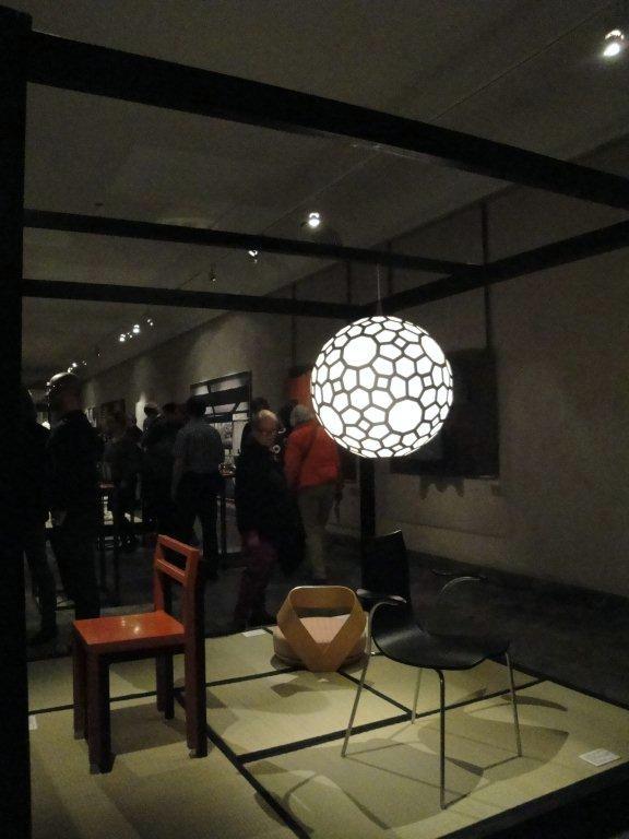 建築分野では、ウッソンやヨーエン・ボー(Jorgen Bo 1919-1999)などアメリカ経由で日本の伝統建築から強い影響を受けた建築家がたくさんおり、一冊のまとまった本が書けるほど、日本からの影響は大きいです。 展覧会では、吉田鉄朗がドイツ語で出版した、「日本の住宅」の本が展示され、1954年にエリック・クリスチャン・ソーレンセン(Erik Christian Sorensen 1922-2011)が設計した自宅が大型パネルで紹介してあります。 小さめの6畳の畳が用意され、デンマーク人作家が作った大きい壺や日本の信楽の壺が並べられています。 別の畳には、ポール・ケアホルム (Poul Kjaerholm 1929-1980)の椅子PK20 やテーブルが置かれて、畳とすんなり調和しています。