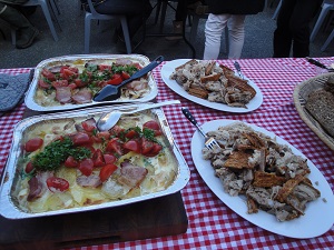 昼食時間は両日13時から1時間半くらいでした。初日は約60人、日曜日は50人ほどの参加がありました。ローマハウスは60戸あり、100人くらい住んでいます。沢山の人が参加した理由は好天だったことや久しぶりの共同作業だったことです。高齢者は作業に参加しなくても、会話や食事を楽しみに来ます。毎年担当する通りが違うので昼食はバラエティーに富んでいてどれも美味しく、もてなしの心が伝わってきます。食事が盛り付けられている器など、どんなものを日常使用しているのか観察するのも面白いです。別の通りに住んでいるのでほとんど見かけない住民や新しく引っ越して来た若い夫婦とも初めて会いました。最年少は半年前に生まれた赤ちゃんでした。引っ越してくる年齢層が高い中、30代の若い世代は珍しいです(職業はやはり建築家との事です)。予定の人数を45人として用意した昼食はほとんど奇麗になくなりました。おふくろの味がするフリカデラーやレバーペーストはいつも人気があります。私は初日にバナナケーキ、二日目にアーモンドケーキなどを焼きましたが、これもお蔭様でほとんどはけました。前回の担当の時抹茶ケーキを焼いたことを覚えていた人から、今回のケーキは緑色じゃないね、と言われました。食事後余った料理を希望者に分けたり、ゴミの始末、皿洗い、机や椅子を畳んだり食事会の後始末が終わったのは16時ごろでした。