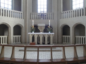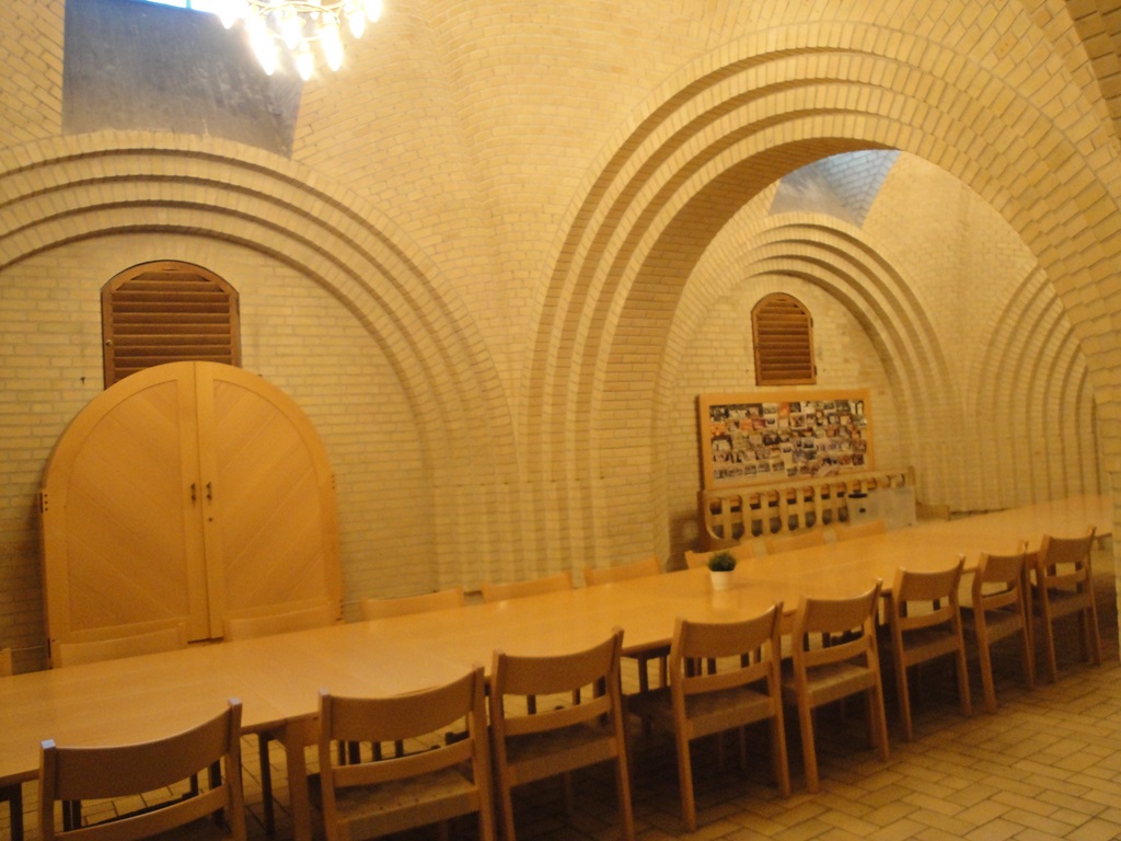 1931年、42歳だったコーア・クリントは父の設計図をもとに教会の工事を続けました。 彼が設計したのは有名な信者用と牧師用の椅子、オルガン、説教台、祭壇、賛美歌の番号掲示板などです。 レンガの床の色を見ると、塔のある教会の床の部分が増築された床よりくすんでいので境目がはっきりわかります。 1940年9月、ドイツ占領下の中、ようやくグロントヴィ教会が完成しました。 教会の建設に5百万個のレンガが使われました。